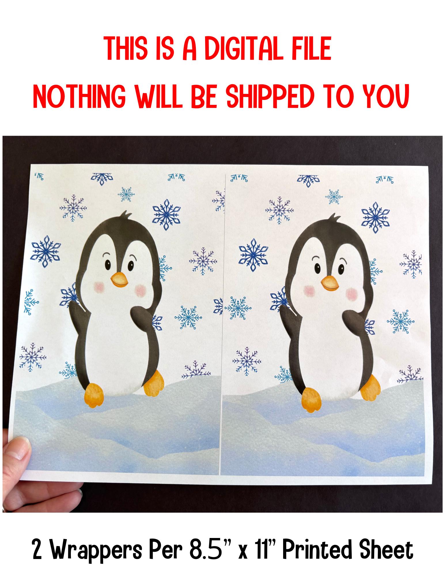 (1) 8.5” x 11” PDF file with 2 printable penguin candy wrappers per page (fits standard 1.55 oz chocolate bars)